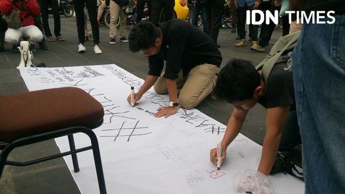 Sejumlah momen diabadikan IDN Times dalam aksi yang diikuti tak lebih dari 100 orang di perempatan Tugu Pal Putih Yogyakarta, Rabu, 16 Oktober 2019 sore. Apa saja itu rupa-rupa cara mereka menyuarakan tuntutannya?
